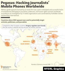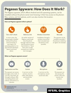 But out of Current Time’s coverage zone, only two countries, Azerbaijan and Kazakhstan, feature prominently in the findings of the Pegasus investigation published on July 18 by Forbidden Stories, a French non-profit that works with persecuted journalists, and human rights defender Amnesty International along with 17 partner media organizations.